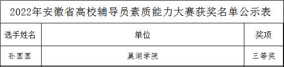 4月28日至30日,由中共安徽省委教育工委主辦、教育部高校思想政治工作隊伍培訓研修中心承辦的2022年安徽省高校輔導員素質能力大賽以線上方式進行。經過激烈角逐,我校旅游管理學院輔導員孫圓圓榮獲大賽三等獎。