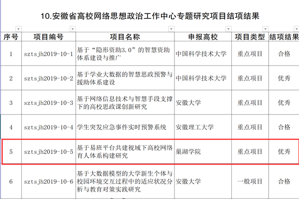 近日,省教育廳公布2019年高校思想政治工作能力提升計劃結項結果,我校黨委副書記阮愛民主持的省級網絡思政重點研究項目《基于易班平臺共建視域下高校網絡育人體系構建研究》(編號sztsjh2019-10-5)順利結題并獲評“優秀”等次。