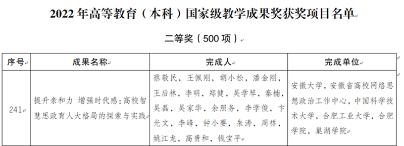 近日,教育部公布2022年國家級教學成果獎名單,校黨委委員、副校長周祥參與的《提升親和力 增強時代感:高校智慧思政育人大格局的探索與實踐》項目喜獲2022年高等教育(本科)國家級教學成果二等獎。