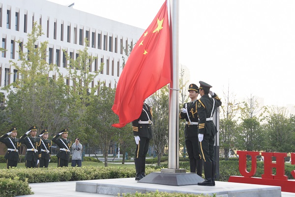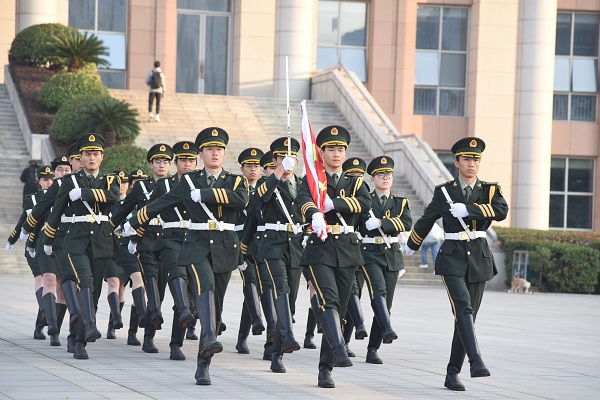 早晨7時,國旗護衛隊邁著矯健的步伐,護衛五星紅旗走上升旗臺。嘹亮的國歌聲響起,五星紅旗迎風冉冉升起,在場師生行莊重肅穆的注目禮。
