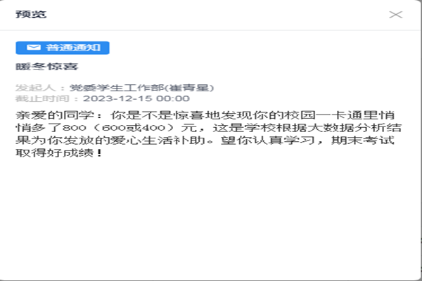 “親愛的同學:你是不是驚喜地發現你的校園一卡通里悄悄多了800(600或400)元,這是學校根據大數據分析結果為你發放的愛心生活補助。望你認真學習,期末考試取得好成績!”。“愛心餐補”是一份細致貼心的“隱形資助”,讓“暖冬行動”在潤物無聲中暖意融融。它既不是學生自己申請的,也不是通過班級評議選出來的,而是學校利用大數據“精準”評定困難生、“悄悄”發放的。這份餐補既做到了精準資助、又保護了學生隱私。據統計,巢湖學院2023年秋學期“隱形資助”發放對象256人,共計發放資助資金13.64萬元。