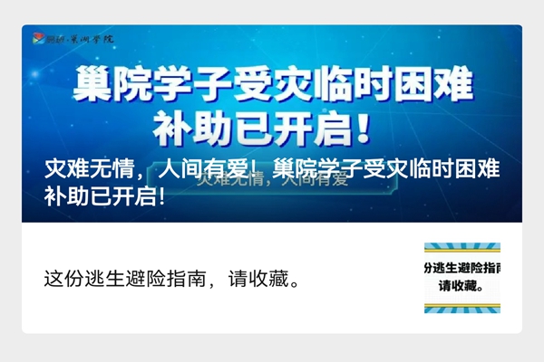 近期,甘肅、青海等地突發地震,造成受災地區經濟損失嚴重,學校第一時間啟動巢院學子受災臨時困難補助工作,通過大數據精準摸排167名甘肅籍學生,利用“輔導貓”點對點發送關懷信息,指導各學院細致摸排受災學生。截至目前,共計有8名學生的家庭因此次自然災害導致房屋受損、經濟損失等困難,學校已啟動臨時困補程序,為受災學生發放臨時困難補助,同時認真做好受災學生心理關懷工作,給予學生精神鼓勵和關心關愛。