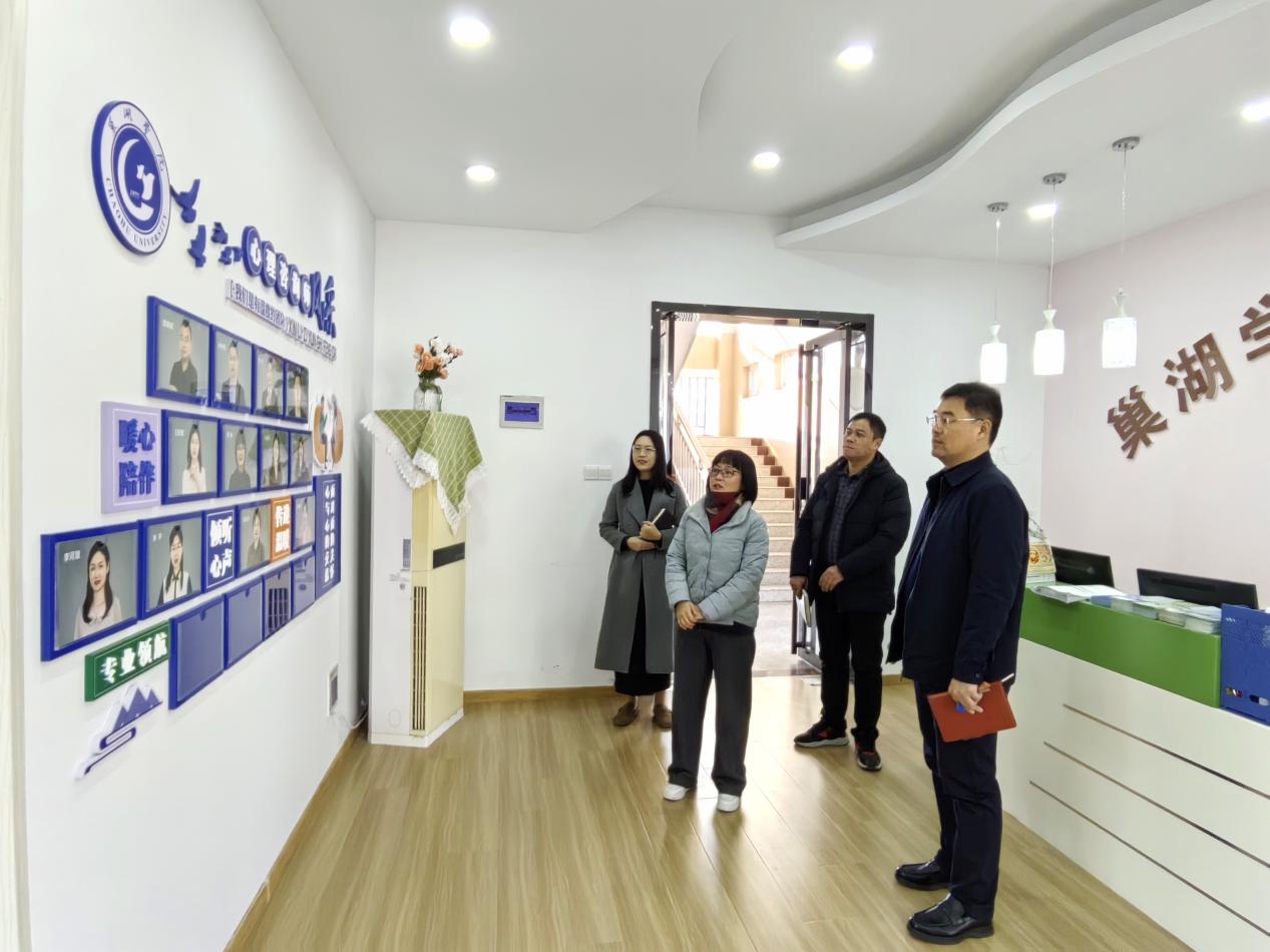 為進一步提高學校心理健康教育工作水平,1月8日,巢湖學院黨委副書記宋立敏到心理健康教育中心調研指導工作,聽取工作匯報,進行座談調研,全面了解學校心理健康教育與咨詢工作開展情況。心理健康教育中心主任華紫武、副主任鄭艷、秘書王安琪、專職心理咨詢師張碧影參加調研座談。