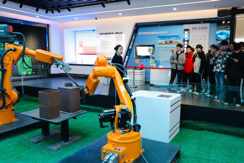 師生一行首站抵達蕪湖市大學生實習實踐基地,深入了解基地在就業服務、職業咨詢、技能培訓及企業資源對接等方面的配套支持。通過實地參觀和現場講解,畢業生們對蕪湖市人才政策和基地配套服務有了直觀認識。在蕪湖產業創新館,在講解人員帶領下,畢業生沉浸式觀摩當地支柱產業發展情況,以及新能源、人工智能等戰略性新興產業的創新成果。不少同學表示,蕪湖蓬勃的產業生態和創新氛圍為職業發展提供了廣闊空間。