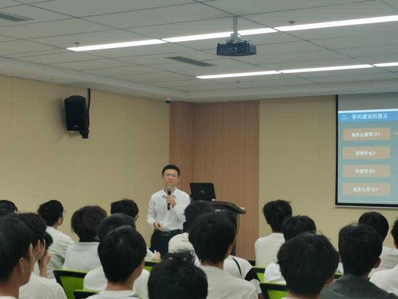 蘇潔紅從學校獲得“全國大學生自強之星”的沈李祥同學事跡引入,以“加強班級建設,營造良好學風”為主題,從學風建設的內涵、意義以及如何加強學風建設三個方面入手,針對班級班委和學生如何共同努力營造良好學風提出指導意見。最后,通過問答、宣誓、簽名等方式,引導學生端正學習態度,激發學生學習內驅力。