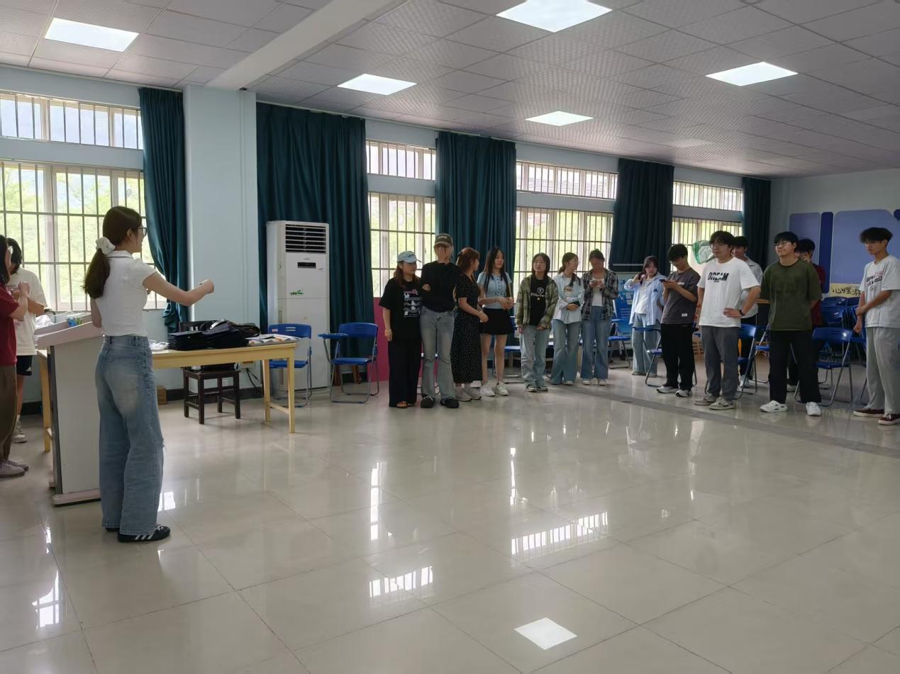 隨后的創(chuàng)意設(shè)計競賽將活動推向高潮。“手疾眼快”活動需參賽學(xué)生在主持人喊指令(如“摸左耳”“摸右肩”)時迅速做出相反動作,做錯者淘汰。30個人分為5組,每組派組長出來應(yīng)戰(zhàn),獲勝組可優(yōu)先選制作材料。大家為自己的小組加油吶喊,期待著滿載而歸的組長和接下來的簪花活動。