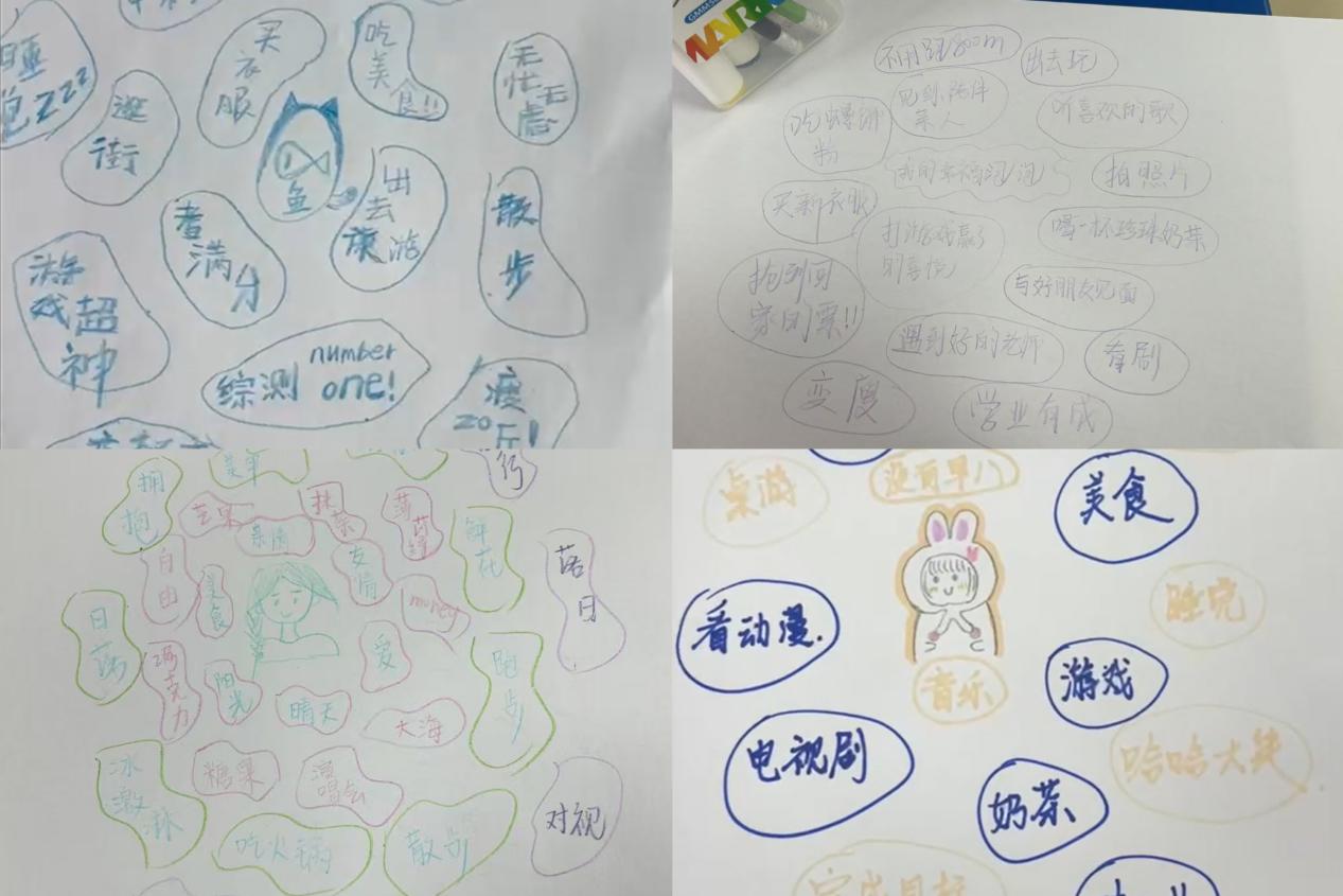 隨后制作“我的幸福泡泡”環節,曹伊詳細介紹了“幸福泡泡”的概念,并悉心講解如何繪制屬于自己的幸福泡泡。同學們專注傾聽,紛紛拿起紙筆,認真勾勒心中幸福的模樣。在繪制過程中,大家沉浸于對幸福瞬間的回憶與暢想,現場氛圍溫馨而美好。