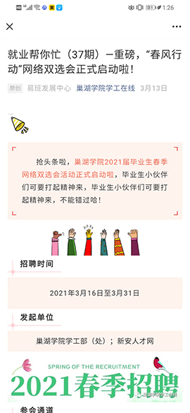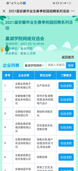 為貫徹落實黨中央國務(wù)院“六穩(wěn)”“六保”決策部署,務(wù)實推進(jìn)畢業(yè)生就業(yè)工作,助力2021屆畢業(yè)生更高質(zhì)量和更充分就業(yè),巢湖學(xué)院聯(lián)合新安人才網(wǎng)于3月16日至31日成功舉辦“春風(fēng)行動”2021屆畢業(yè)生網(wǎng)絡(luò)雙選會。