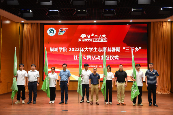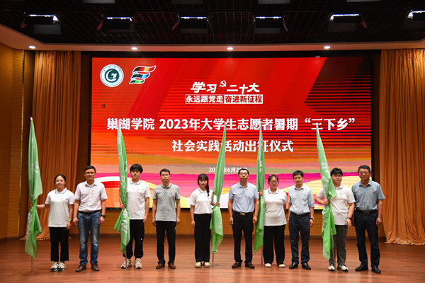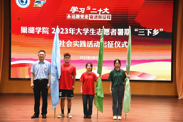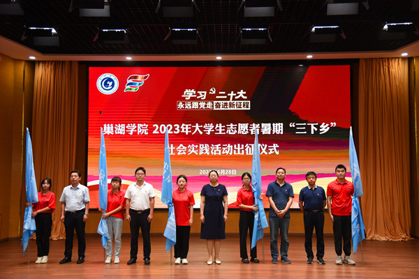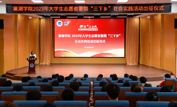 為深入學習宣傳貫徹習近平新時代中國特色社會主義思想和黨的二十大精神,認真落實團十九大部署,堅持在火熱實踐中培育有理想、敢擔當、能吃苦、肯奮斗的新時代好青年,6月28日下午,巢湖學院2023年大學生志愿者暑期“三下鄉”社會實踐活動出征儀式在求實樓報告廳舉行。校黨委書記周峰,黨委委員、黨委組織部部長柯應根,校辦公室、黨委宣傳部、黨委保衛工作部、教務處等相關職能部門負責人和各學院黨政領導出席儀式,各學院團委書記、重點團隊指導教師和成員代表參加儀式。儀式由校團委書記王倩主持。