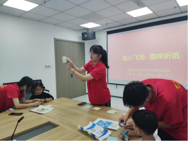 與此同時,為提高活動的多樣性和豐富性,實踐團志愿者為社區青少年準備手工制作材料,在志愿者的帶領下學習制作折疊解壓小玩具,并對作品進行評比,鍛煉了青少年的動手能力和創造性思維,同時又有利于激發青少年們的團隊合作精神,增進同學之間的友誼。