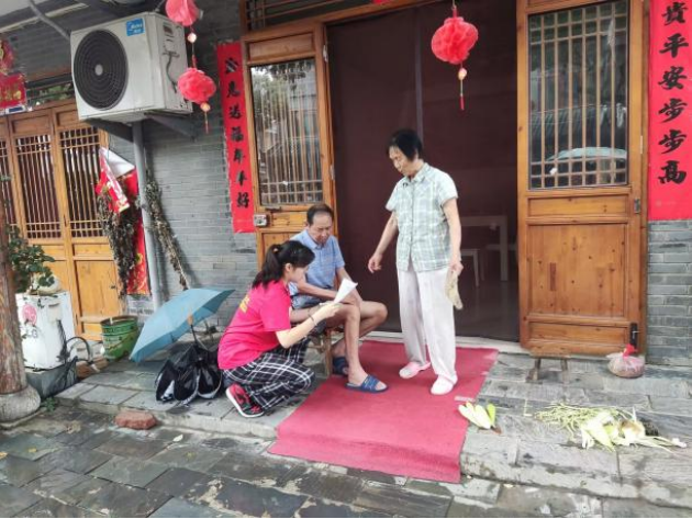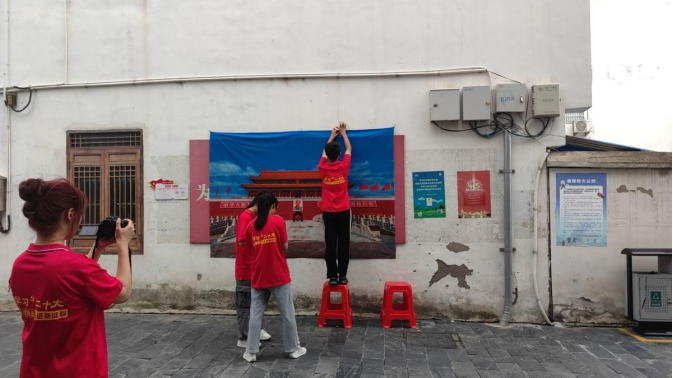 6月29日下午,實踐團隊在社區搭設北京天安門背景幕布并免費提供拍攝服務,社區內的老人們陸續趕來活動現場,志愿者們組織老人排隊等候,耐心指導著老人們拍照的姿勢,為老人留下珍貴回憶,圓一場“北京”夢,定格最美夕陽紅。居民們說道:“年輕的時候沒有這個條件,沒留下什么照片,現在年紀大了,附近沒有什么照相館,出去也不太方便,今天能夠來這兒拍照,心里高興得很。”