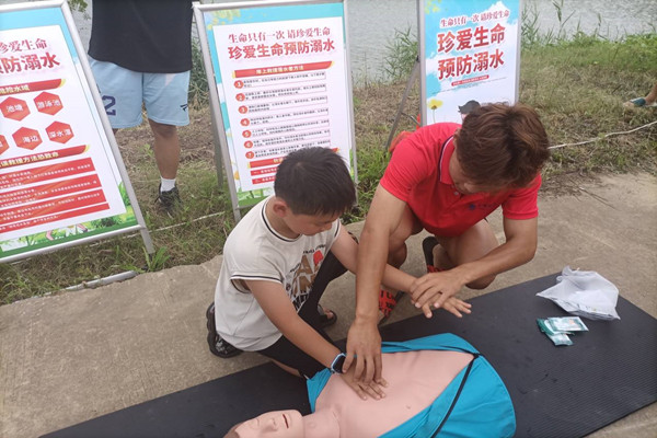 在心肺復(fù)蘇實(shí)操演練環(huán)節(jié),實(shí)操員金柱通過場(chǎng)景模擬、“心肺復(fù)蘇模擬人”等正確流程演示,邊示范邊講解心肺復(fù)蘇的操作要領(lǐng)、方法和步驟,讓家長(zhǎng)和孩子盡可能科學(xué)有效地對(duì)溺水者進(jìn)行搶救。在最后環(huán)節(jié),金柱同學(xué)通過與小朋友實(shí)地互動(dòng)的方法讓孩子們親身體驗(yàn)和了解相關(guān)細(xì)節(jié),對(duì)如何正確進(jìn)行施救、自救有了更深刻的認(rèn)識(shí)。