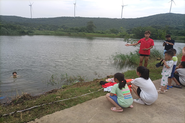 為加深小朋友們的印象,實(shí)踐團(tuán)因地制宜,通過啟發(fā)引導(dǎo)和現(xiàn)場(chǎng)模擬使得小朋友們對(duì)溺水自救知識(shí)有了更生動(dòng)的了解。講解員:“有沒有哪位小朋友知道,當(dāng)人落水時(shí)的第一反應(yīng)動(dòng)作是什么?”小朋友A:“拼命地掙扎,非常地慌張,害怕嗆水。”講解員:“對(duì)!但是我們?nèi)绻@樣能不能讓自己獲救?”小朋友們:“好像不能。”講解員:“沒錯(cuò),拼命掙扎,上下?lián)潋v,這種姿勢(shì)只會(huì)消耗大量體力,還有繼續(xù)下沉的危險(xiǎn)。”說著實(shí)操員王旭跳入水塘,現(xiàn)場(chǎng)演示落水后高舉雙手等錯(cuò)誤的自救方式,小朋友們發(fā)現(xiàn)這樣做反而會(huì)使身體沉得更快。“那我們?cè)撛趺崔k啊?”岸邊宣講員金柱解釋道:“我們可以運(yùn)用仰漂的方法施行自救,這樣需要的力氣小,可以節(jié)省體力。小朋友們仔細(xì)看水塘里哥哥做的正確溺水自救方法。大家要身體往后仰,把嘴巴和鼻子露出水面,慢慢地吸氣呼氣……”