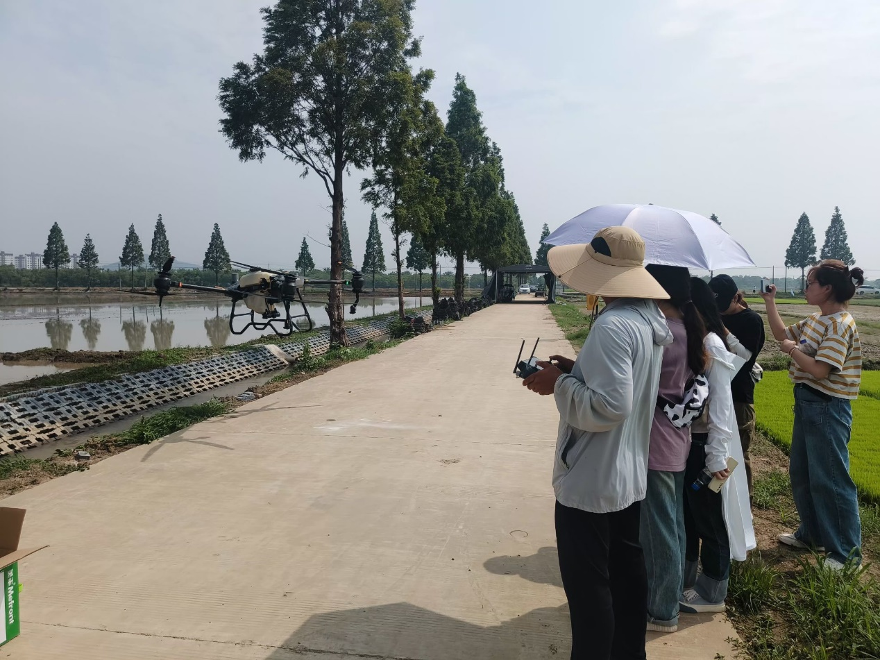 為了解槐林鎮水稻業生長現狀,助力槐林鎮打造稻米+生態產業園,夏鄉稻麥小隊于前往環湖南岸現代農業產業園“皖中有米”水稻種植基地進行實地考察調研活動。與政府工作人員對接后,成員們前往水稻種植基地采訪相關工作人員,在工作人員的講解下,成員們了解到槐林鎮特有的“紫云英+水稻”種植模式。紫云英具有很好的固氮作用。紫云英畝產鮮草可達2000公斤,壓青回田漚肥后,能減少20%化肥用量,并可改善土質板結、酸化嚴重等問題。連續種植三年,土壤肥力和適耕性將顯著提升。自2021年以來,環湖南岸現代農業產業園“皖中有米”水稻種植基地積極推廣“一季水稻+一季紫云英”的種植模式。接著,工作人員向成員們展示無人機噴灑農藥技術,通過實踐操作,成員們了解到,無人機技術采用的噴霧噴灑方式至少可以節約50%的農藥使用量和90%的用水以及90%的時間。通過無人機技術,僅需五分鐘就可完成十畝農田的農藥噴灑工作。