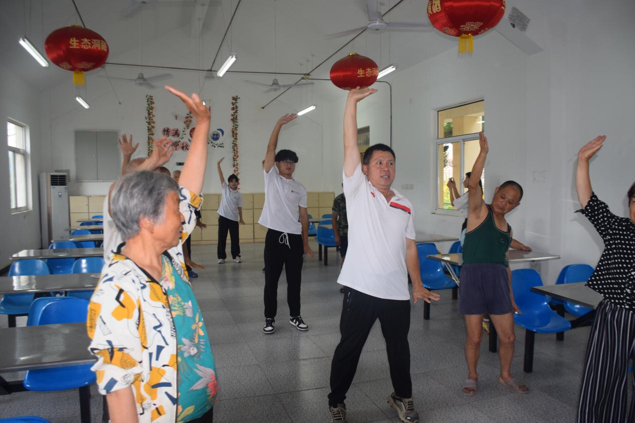 八段錦具有養生保健、強身健體的功效與作用,可以疏通經絡、調理三焦、健脾和胃以及行氣活血,是一套結合形體活動與呼吸的健身方法,對身體有益。文化宣傳團隊成員在團隊指導教師陳永軍的帶領下,指導敬老院老人進行簡單的八段錦招式。