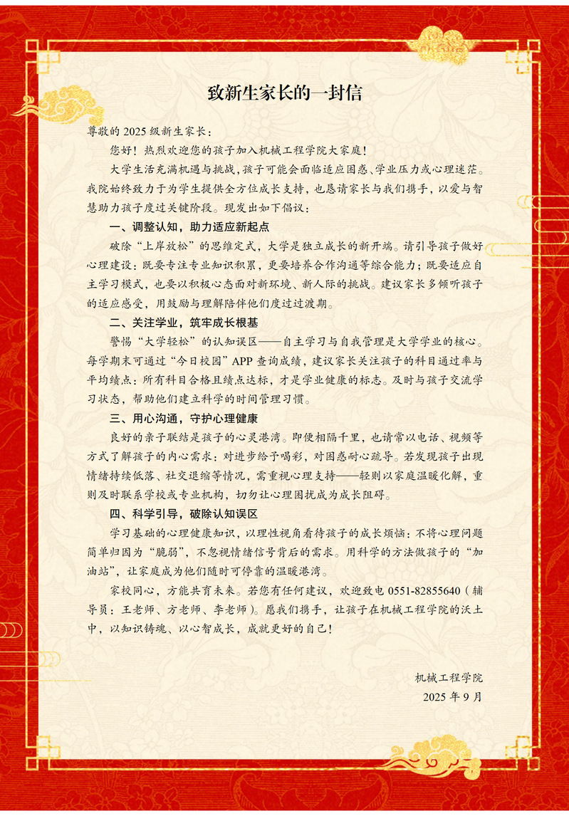 學院通過官方微信平臺發布了致新生家長的一封信,讓家長們能夠更好地了解孩子即將開啟的大學生活,也為家校之間的溝通與合作奠定了良好的基礎。