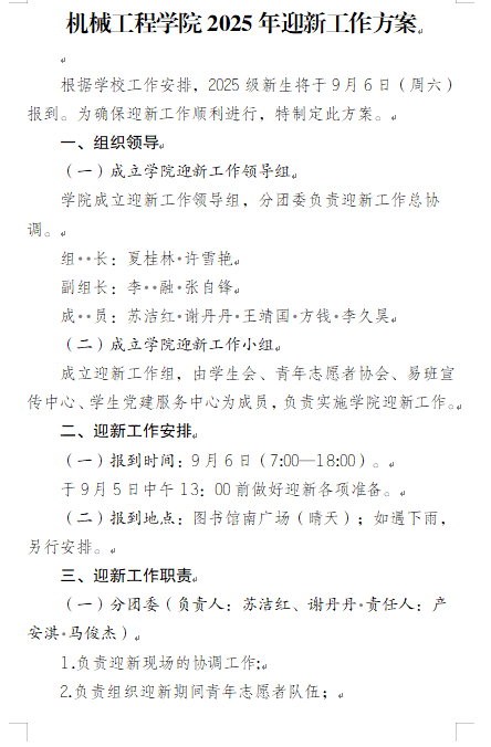 為確保2025級新生能夠順利開啟大學生活,學院早做準備,制定《機械工程學院2025年迎新工作方案》。學院多次召開輔導員、學生骨干和志愿者等會議,對迎新工作進行了全面細致的部署,團委精心策劃“六個一”活動。