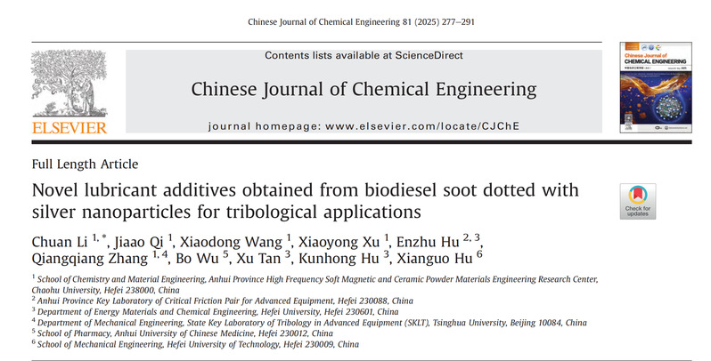 近日,化學與材料工程學院李川博士在中國化工學會旗艦英文學術期刊《ChineseJournalofChemicalEngineering》(中國化工學會會刊,SCI收錄)發表題為“Novellubricantadditivesobtainedfrombiodieselsootdottedwithsilvernanoparticlesfortribologicalapplications”的封面文章。我校為該論文的第一署名單位和通訊單位,論文第一作者為李川博士,2022級化學工程與工藝專業本科生祁佳澳作為第二作者參與實驗設計與數據分析工作,展現出本科生參與高水平科研的創新培養成效。