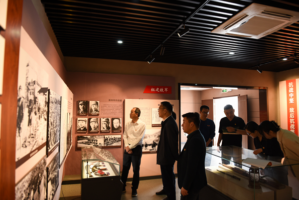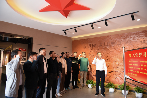 走進三勝村新四軍東進抗日第一槍紀念館,全體黨員在一幅幅珍貴的照片、一件件珍貴的實物、一幕幕逼真再現的場景前駐足觀看,身臨其境地感受新四軍第4支隊在蔣家河口進行的伏擊戰戰況,對當年新四軍東進抗日首戰殲敵告捷的歷史功績,對革命烈士的英雄事跡和紅色革命精神有了更深刻的認識,激發了情感共鳴。隨后,全體黨員在宣傳部黨支部書記張連福的帶領下,重溫入黨誓詞。全體黨員高舉右手莊嚴宣誓,一句句錚錚誓言,是擔當、是責任,是心之所向、是行之所往,鏗鏘有力的聲音在耳邊久久回響,黨員們的初心受到洗禮,理想信念更加堅定。
