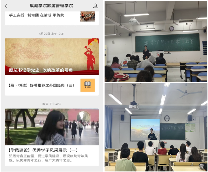 用好文化資源,潛心培育優(yōu)良學(xué)風(fēng)。學(xué)院注重把學(xué)風(fēng)建設(shè)擺在重要位置,通過巡查課堂、閱讀環(huán)巢湖文化書籍、優(yōu)秀校友報(bào)告會(huì)、優(yōu)秀學(xué)子風(fēng)采展等抓手,在學(xué)院營造“愛讀書,讀好書,善讀書”的濃厚氛圍。同時(shí),發(fā)揮省級(jí)科研平臺(tái)作用,充分將文化資源融入到學(xué)風(fēng)建設(shè)中,如學(xué)院以“邊讀邊走環(huán)巢湖”思政品牌項(xiàng)目為抓手,組織學(xué)生開展環(huán)巢湖廉政文化作品征集、南下干部革命精神調(diào)研、環(huán)巢湖文化書籍閱讀等3項(xiàng)活動(dòng),讓學(xué)生喜愛上環(huán)巢湖地域文化。