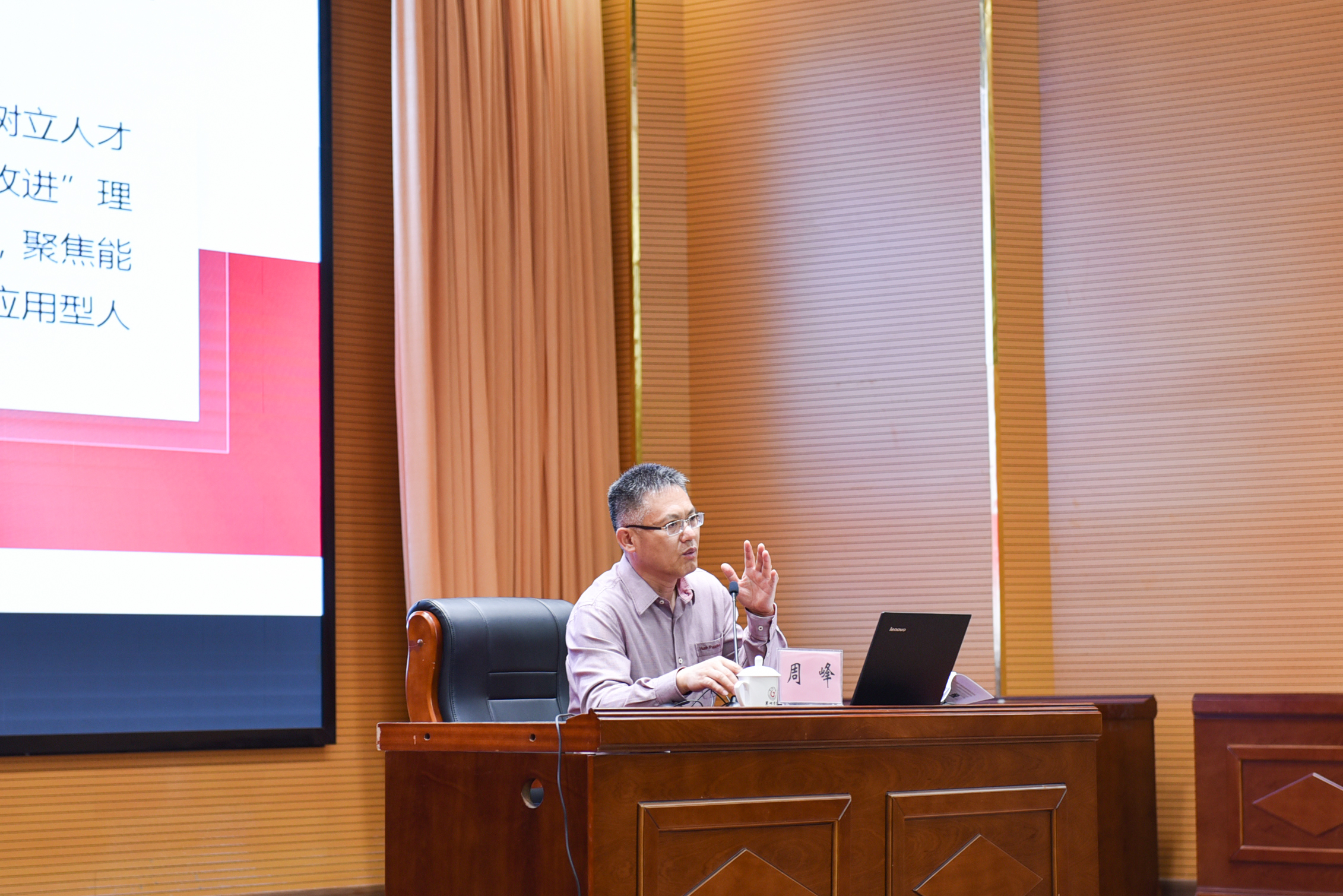 周峰結(jié)合個人學(xué)習(xí)體會和學(xué)校發(fā)展實際,就學(xué)習(xí)貫徹好習(xí)近平新時代中國特色社會主義思想從深刻把握習(xí)近平新時代中國特色社會主義思想的理論體系和世界觀方法論、深刻把握習(xí)近平總書記關(guān)于教育的重要論述、以主題教育凝心鑄魂推動學(xué)校事業(yè)高質(zhì)量發(fā)展三個方面作深入講授。