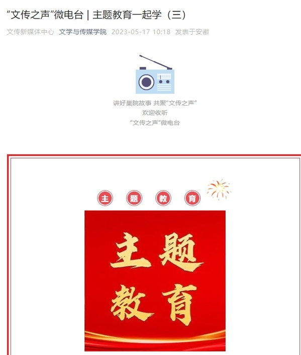 用好微電臺,“聲”入生心。文傳學院始終致力于打造“文傳之聲”微電臺,旨在講好文傳故事,弘揚紅色文化,傳遞社會正能量。自主題教育開展以來,新媒體系學生黨員學以致用、以學促干,截至目前共推出微電臺播報主題教育學習六期,用青春之音傳播好主題教育之“聲”。