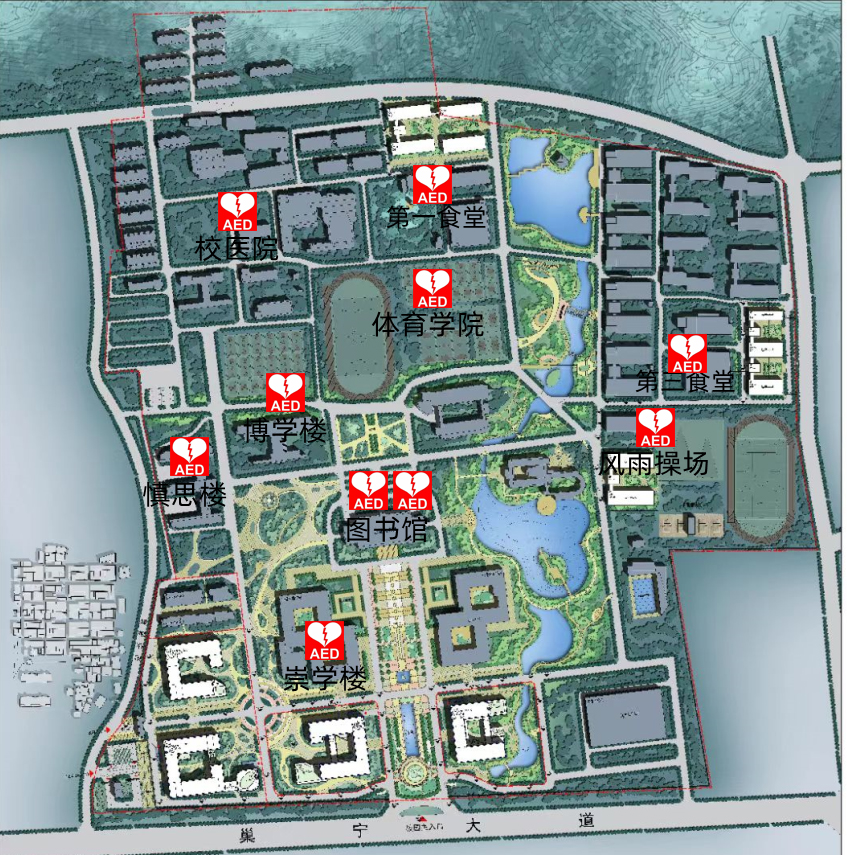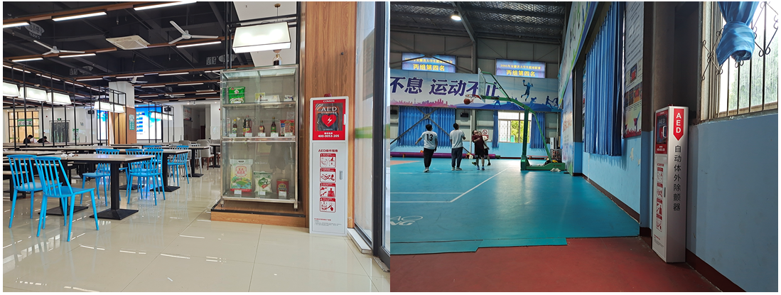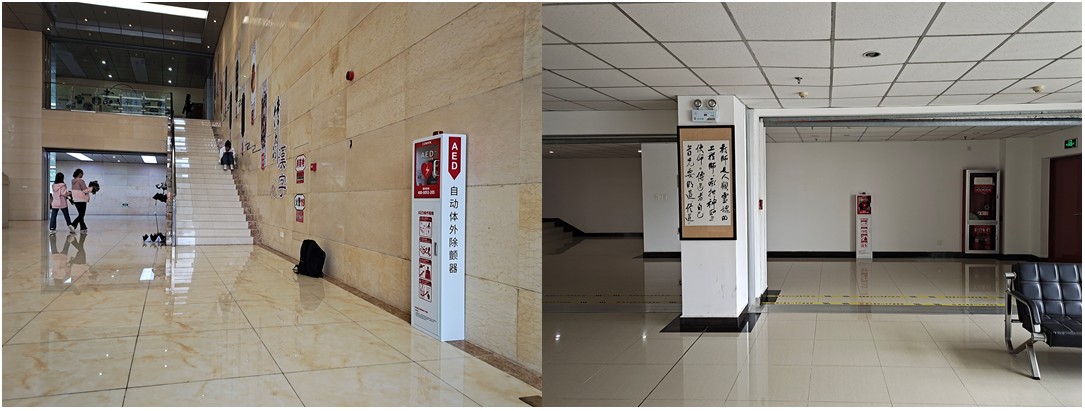 2023年6月5日,后勤處結合前期醫療專家選址建議和專業人員安裝位置實地考察情況,在圖書館、慎思樓、博學樓、運動場、食堂、風雨操場、校醫院等公共場所完成10臺AED設備的安裝工作,并在每臺AED箱體內配置操作流程卡、急救箱等物品,以方便突發狀況下就地開展救護。