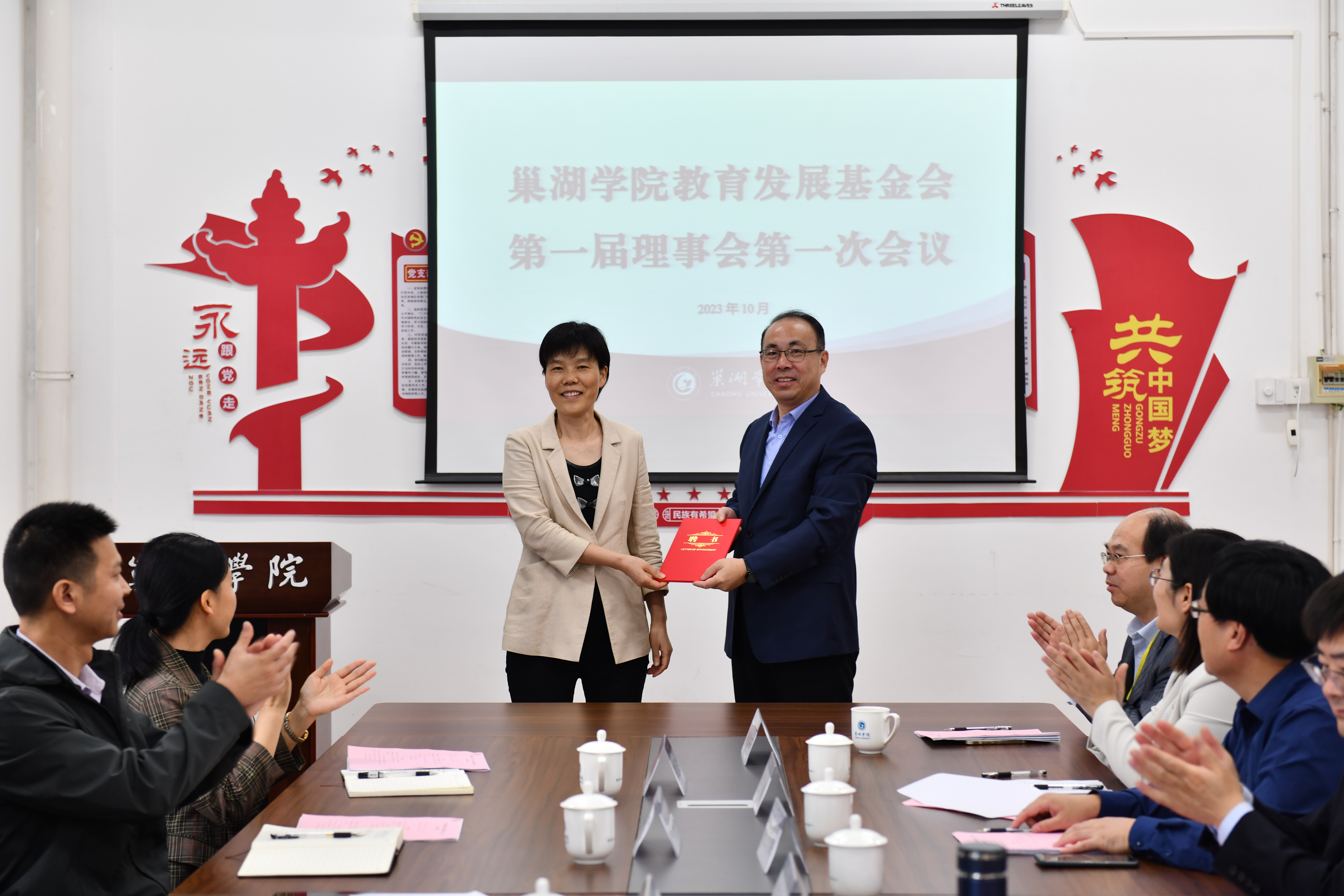 隨后,在求實樓二樓教務處會議室召開巢湖學院教育發展基金會第一屆理事會第一次會議,表決通過《巢湖學院教育發展基金會章程》《巢湖學院教育發展基金會財務管理制度》《巢湖學院教育發展基金會捐贈管理辦法》,選舉產生了第一屆理事會理事長、副理事長、秘書長。會上,校領導為第一屆理事會理事長、副理事長、秘書長頒發了聘書。