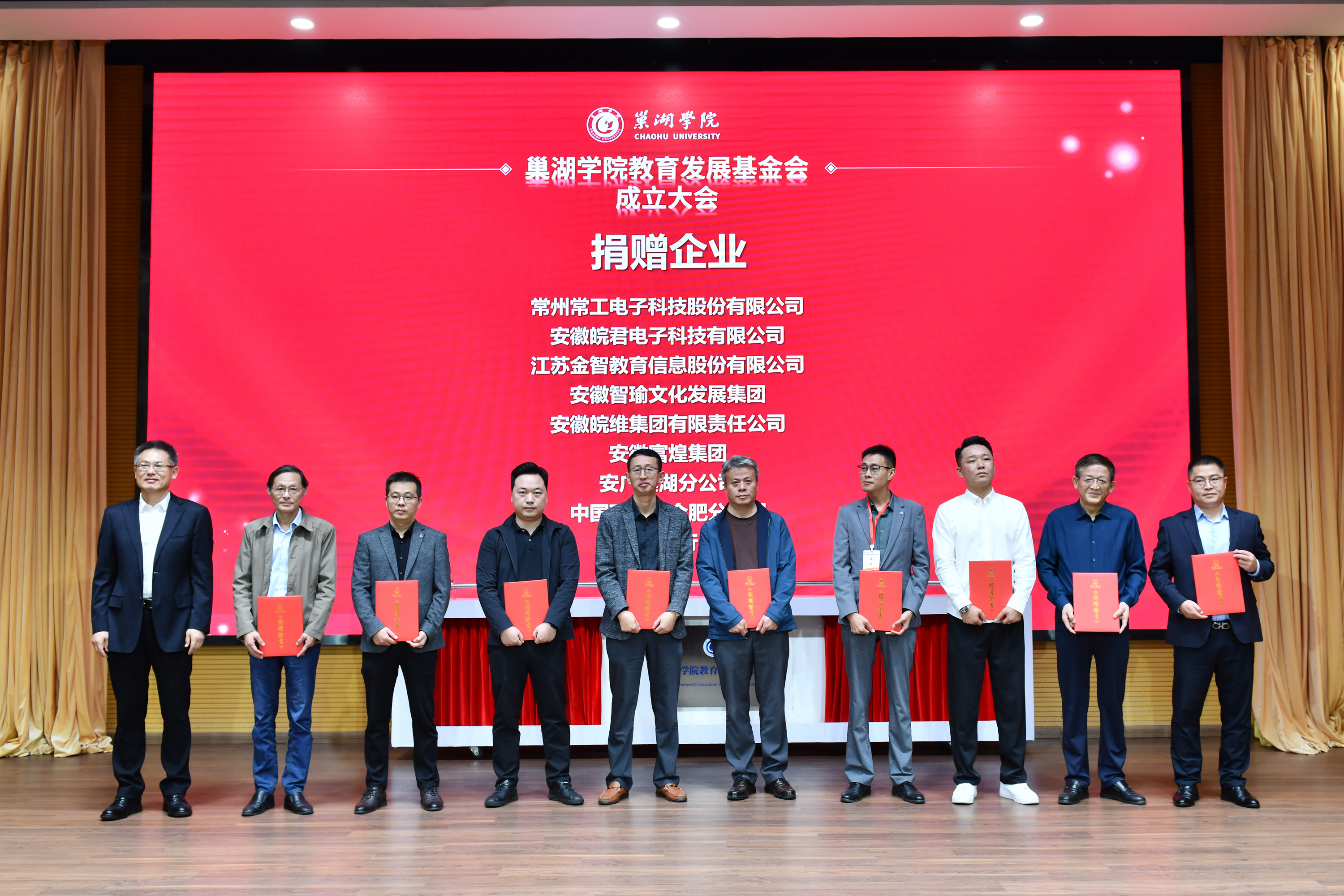 在與會人員的共同見證下,由校領導、特邀嘉賓、校友代表齊手推桿,拉開紅色大幕,為巢湖學院教育發展基金會揭牌,正式宣布巢湖學院教育發展基金會成立了。在熱情歡快的旋律中,舉行捐贈儀式,校領導依次為捐贈單位代表、捐贈校友企業、捐贈校友頒發捐贈證書,全場氣氛熱烈,掌聲不斷。