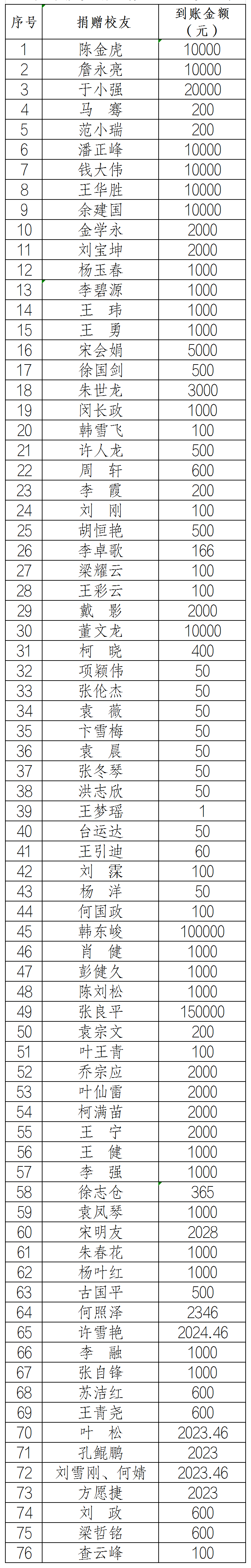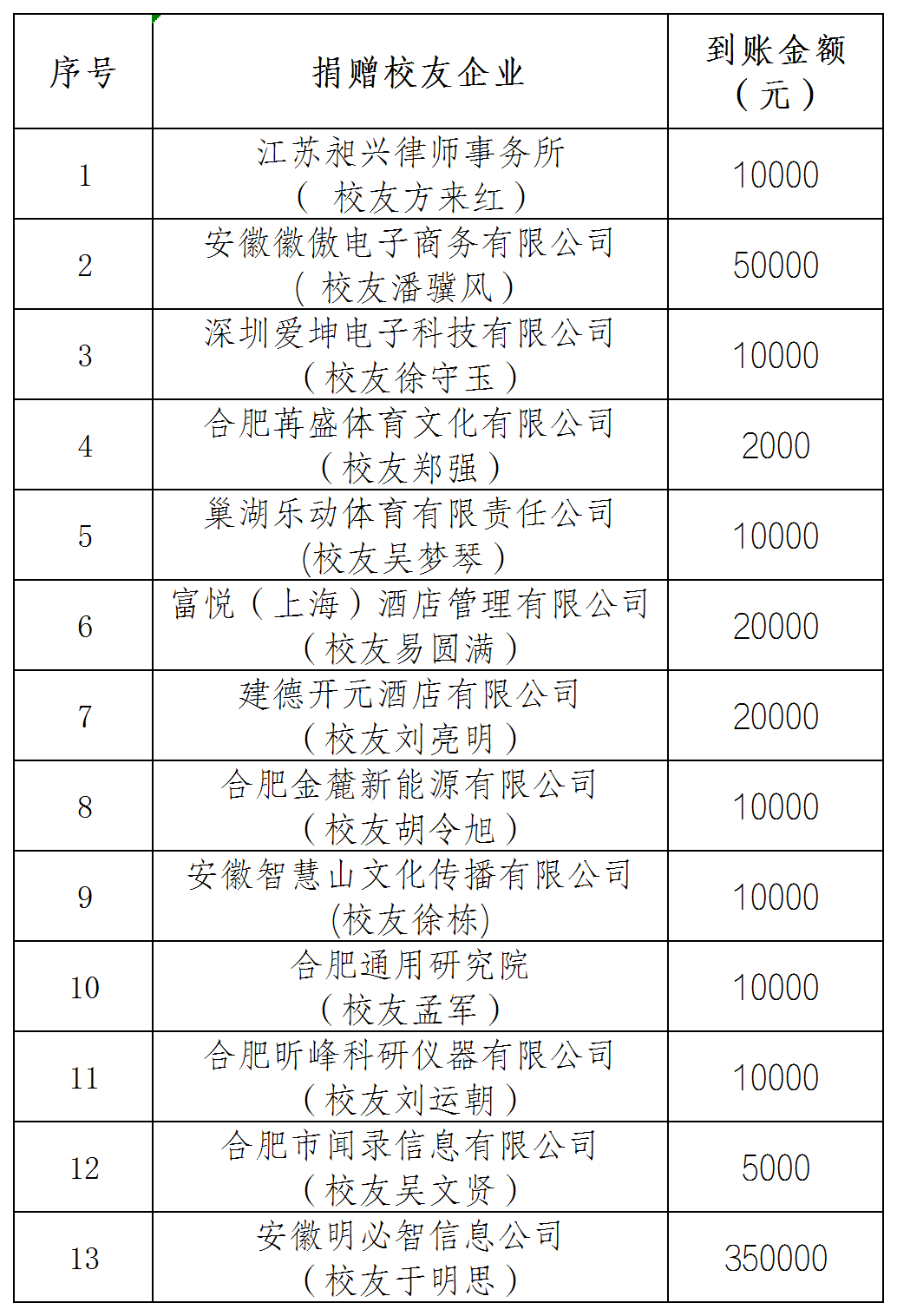 還有部分校友匿名捐贈,在此向所有捐贈校友表示感謝。有問題請聯系校友辦公室楊老師:0551-82361509。