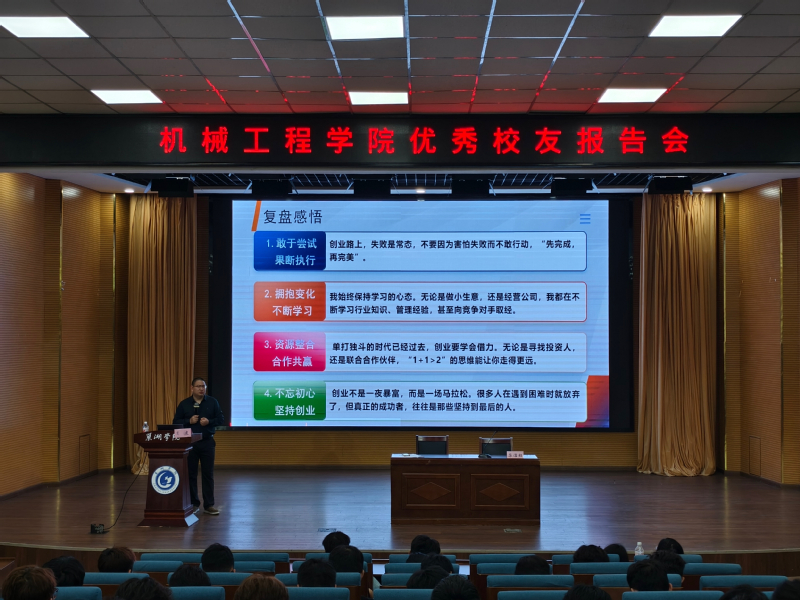 為發揮優秀校友的示范引領作用,激勵廣大學子奮發進取,4月24日,機械工程學院在求實樓報告廳舉辦優秀校友報告會。2017屆校友、安徽邦創餐飲管理有限公司創始人肖健應邀來校做創業報告。來自全校200余名學生到場聆聽,報告會由機械工程學院團委書記、校友工作聯絡員蘇潔紅主持。