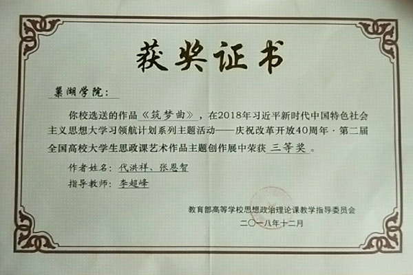 在此次大賽中,藝術學院師生獲得佳績,由李超峰老師指導代洪祥、張恩智同學的作品《筑夢曲》獲得全國繪畫作品類三等獎。作品入編“慶祝改革開放40周年 第二屆全高校大學生思政課藝術作品展”作品集。此次展覽安徽省獲得一等獎2件,二等獎3件,三等獎6件,優秀獎若干件。