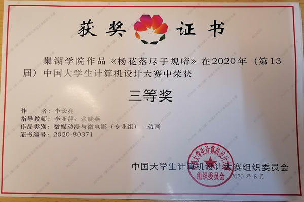 “中國大學生計算機設計大賽”是由教育部高等學校計算機類專業教學指導委員會、教育部高等學校軟件工程專業教學指導委員會、等單位聯合主辦。今年共有近700所院校約3萬件作品參加。經過全國各省級賽區的選拔和評比,共有4646件作品入圍國賽。經過嚴格的篩選和評比,我院參賽作品在國內眾多高校的幾千件作品中脫穎而出。由王曉暉、陳友祥、曹藝、薛梅老師指導的學生作品在數媒中華優秀民族文化元素(專業組)中共獲得3個獎項。其中二等獎1項,三等獎2項。余曉燕老師指導的學生作品在數媒動漫與微電影(專業組)中獲得1項三等獎。