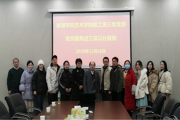 根據省委組織部《關于深入開展在職黨員到社區報到為群眾服務工作的意見(試行)》和省委教育工委《關于在省屬高校深入開展在職黨員到社區報到為群眾服務工作的實施意見》精神,為落實校黨委《關于深入開展在職黨員到社區報到為群眾服務工作的通知》要求,12月16日下午,藝術學院分黨委委員副院長褚春元、分黨委委員教工第三黨支部書記田世彬帶領支部部分黨員,代表支部24名同志進安徽三瓜公社投資發展有限公司為群眾服務工作開展了集中報到活動,安徽三瓜公社投資發展有限公司黨支部書記兼執行社長宋萍、社長助理施恩、企宣部石雅亮出席會議,會議在半湯鄉學院會議室舉行。