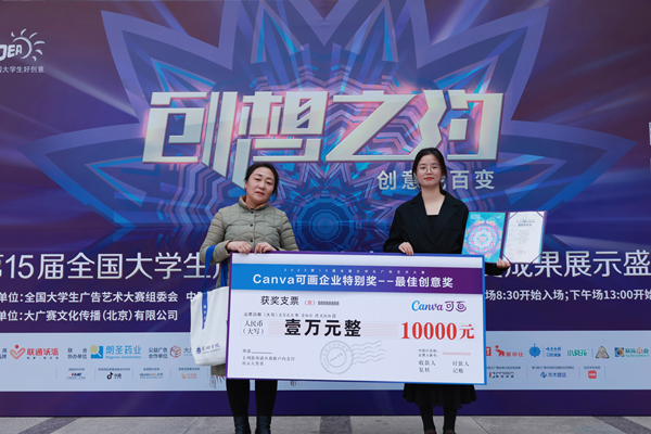 此次比賽,共有8個團隊獲得Canva可畫企業(yè)特別獎,巢湖學(xué)院是安徽省唯一一所獲得此項特別獎的高校。11月23-26日指導(dǎo)教師代表張磊帶領(lǐng)主創(chuàng)李計彤同學(xué)赴北京參加了在中國傳媒大學(xué)舉行的”創(chuàng)想之約“第15屆全國大學(xué)生廣告藝術(shù)大賽學(xué)科競賽成果展示盛典。
