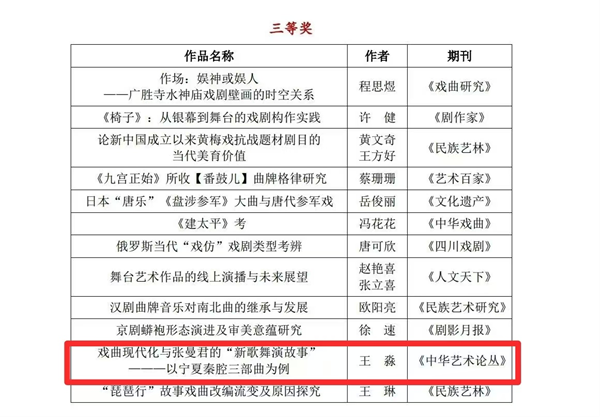 近日,由上海戲劇學(xué)院、全國(guó)戲劇期刊聯(lián)盟、田漢戲劇獎(jiǎng)組委會(huì)、遼寧省文化藝術(shù)研究院聯(lián)合主辦的第38屆田漢戲劇評(píng)選活動(dòng)以及2024年全國(guó)戲劇期刊聯(lián)盟年會(huì)在遼寧成功舉辦,來(lái)自全國(guó)33家戲劇期刊的負(fù)責(zé)人或代表等共計(jì)60余人參加本次活動(dòng),125篇(部)作品(劇目)參與了劇目獎(jiǎng)、劇本獎(jiǎng)、理論獎(jiǎng)、評(píng)論獎(jiǎng)的評(píng)選。據(jù)第38屆田漢戲劇獎(jiǎng)組委會(huì)公布,我校美術(shù)與設(shè)計(jì)學(xué)院王淼老師的學(xué)術(shù)論文《戲曲現(xiàn)代化與張曼君的“新歌舞演故事”》獲得第38屆田漢戲劇獎(jiǎng)理論獎(jiǎng)三等獎(jiǎng)。