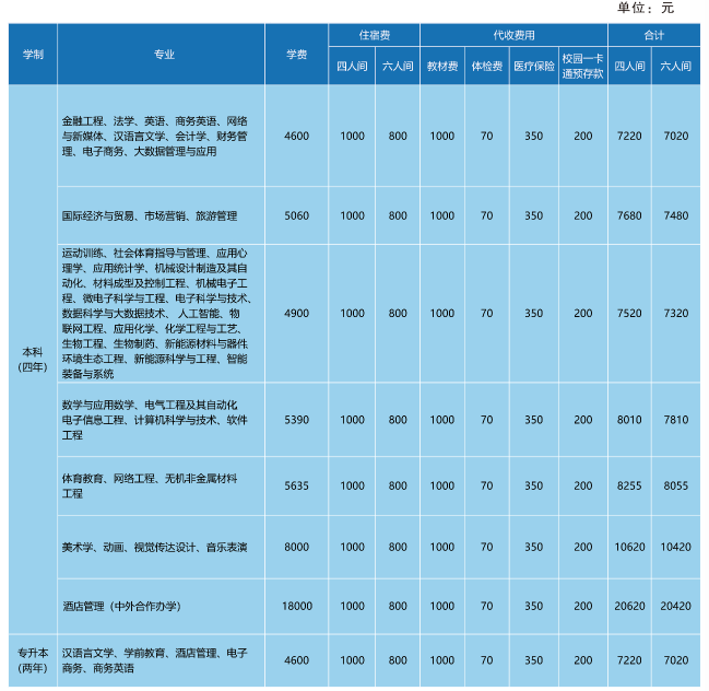 (1)住宿費標準為:六人間800元/生,四人間1000元/生,宿舍由學校統一安排,請全體新生以宿舍安排結果按相應標準繳納住宿費。